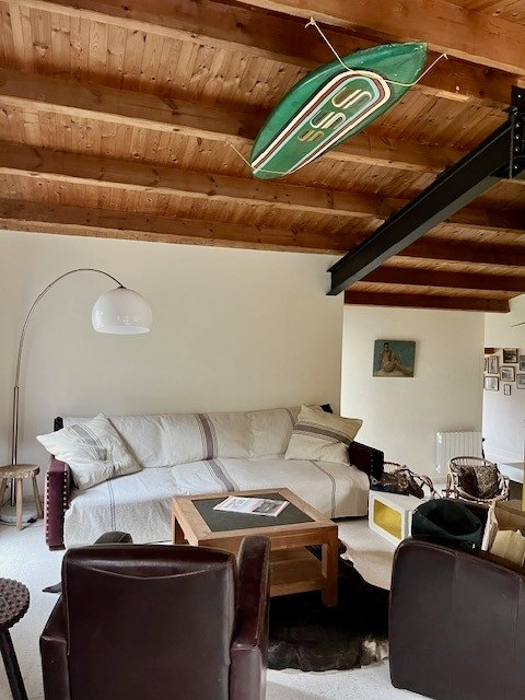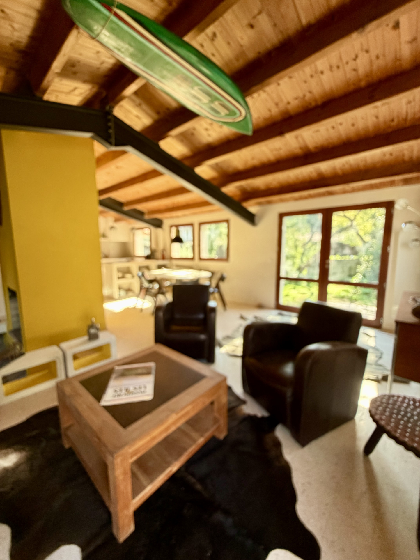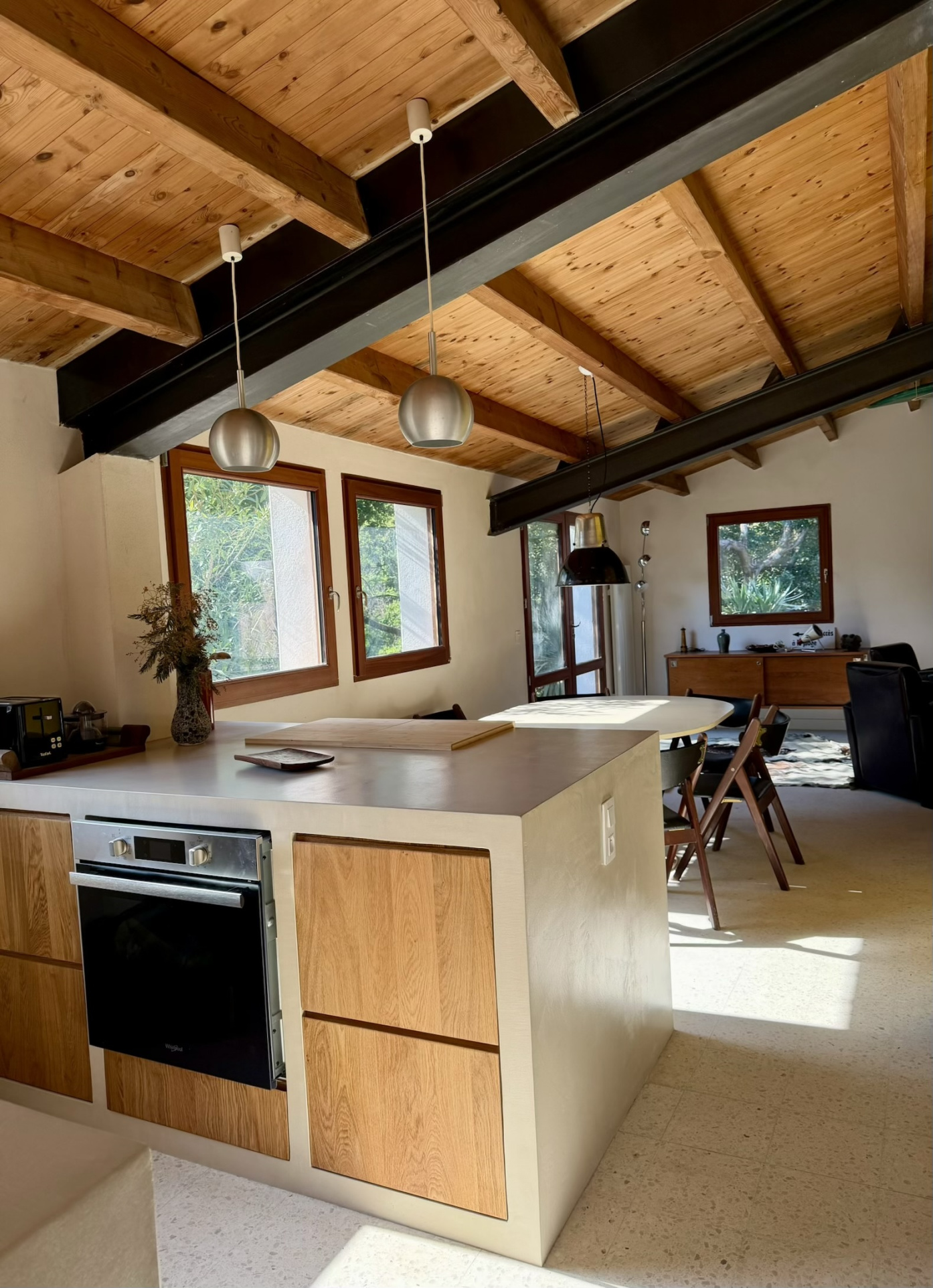Pièce de vie lumineuse, salon décaissé, cuisine équipée, espace bureau.
